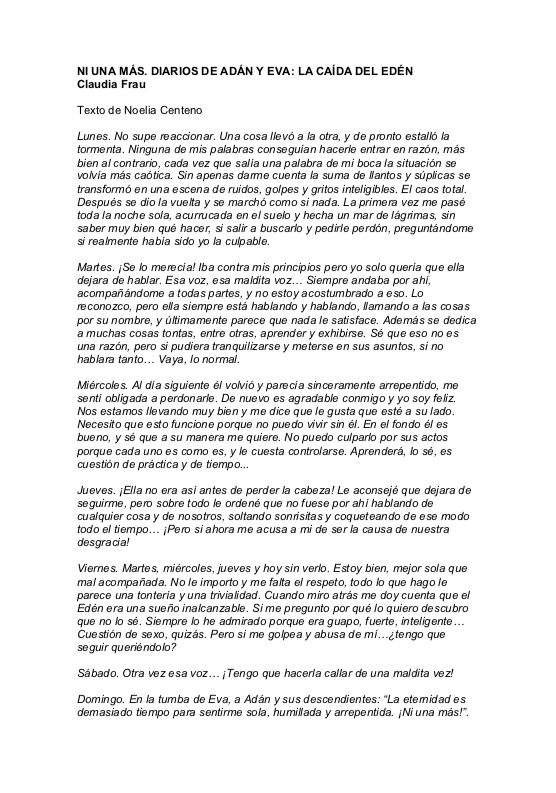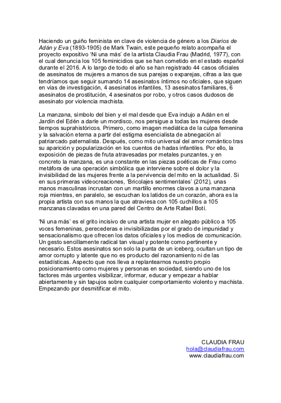 Este proyecto comenzó en 2015 en una exposición colectiva en la Fundación Antonio Saura en Cuenca, una manzana clavada a la pared con un cuchillo, como un grito desesperado para hablar sobre las muertes de mujeres por violencia machista. A comienzos del año siguiente se realizó la instalación completa en la que pudieron verse 57 manzanas en la Fundación Valentín de Madariaga en Sevilla, en memoria de las 57 muertes oficales de mujeres a manos de sus parejas o exparejas. En 2017 se realizó sumando no sólo los casos oficiales si no todos los feminicidios, en la fundación Botí de Córdoba en esta intervención, la artista utiliza 105 manzanas como símbolo de los 105 feminicidios que se han cometido en España durante 2016. Frau ha recordado que el pasado año se registraron 44 casos oficiales de asesinatos de mujeres a manos de parejas o exparejas, cifra a la que se suman 14 asesinatos íntimos no oficiales –en vías de investigación–, cuatro asesinatos infantiles, 13 asesinatos familiares, seis asesinatos de prostitución, cuatro por robo y otros casos dudosos. En 2024 ¨Ni una más¨ se muestra en el Museo de arte contemporáneo Moreno Galván con 101 manzanas, por los 101 feminicidios de 2023. Esta instalación tiene un carácter anual, para visibilizar este drama.